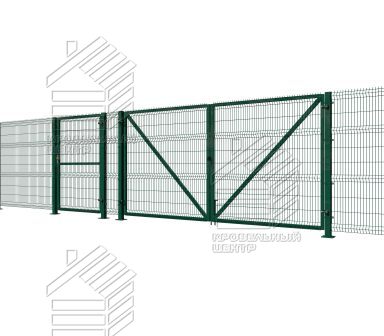В состав ворот входят: столбы сечением 80*80*2 мм под бетонирование — 2 шт., створки из профиля 60х40х1,2 мм с заполнением из сетчатой панели — 2 шт., регулируемые петли — 4 шт., проушины для навесного замка, упоры в землю. Открывание универсальное: наружное/внутреннее.